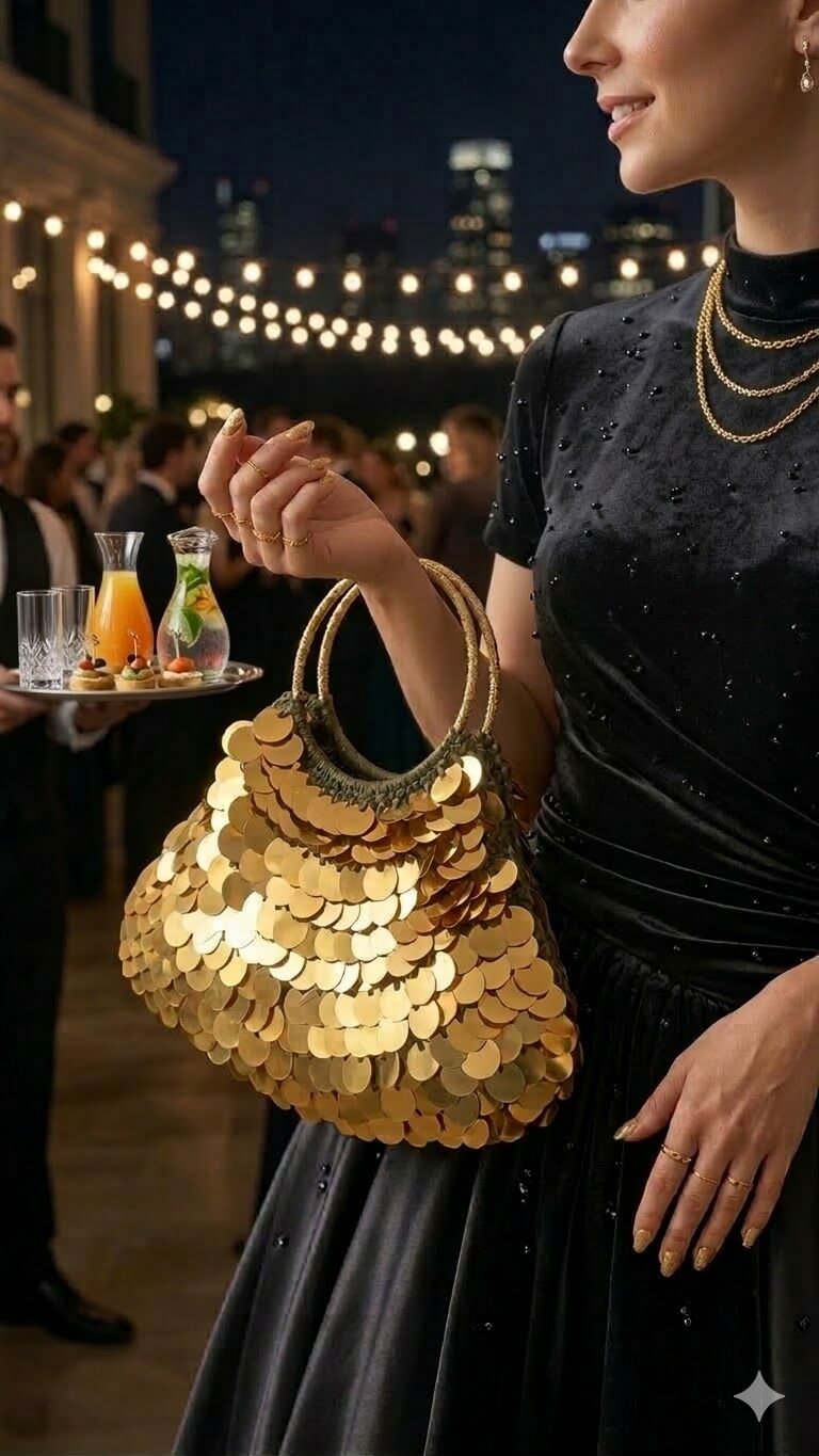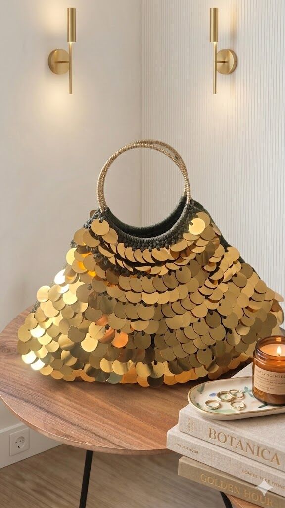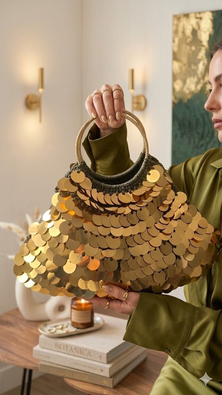 Işıltılı pullarla süslenmiş el örgüsü çantamız, stilinize parlaklık katacak özel bir aksesuar. Her bir ilmek özenle örülerek, pul detaylarıyla birleştirilerek benzersiz bir tasarım ortaya çıkarılmıştır.
